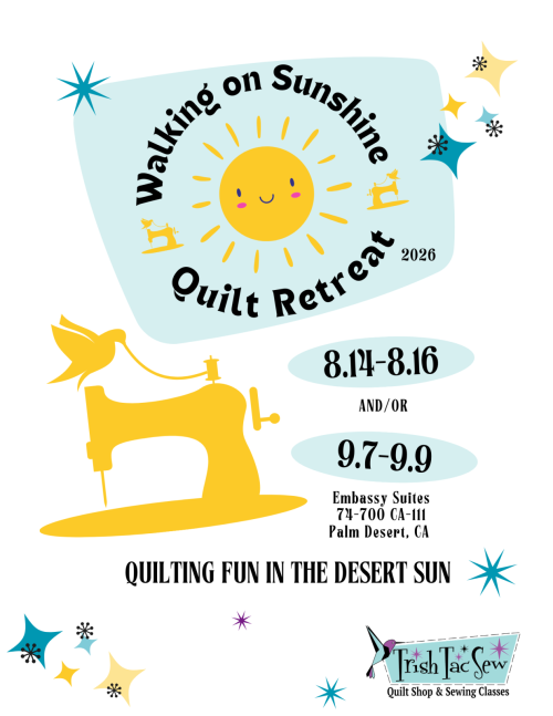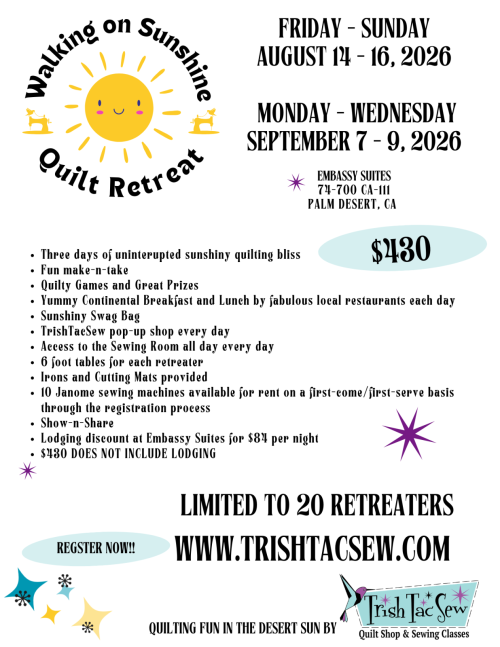 Download the Retreat Flyer here: WALKING ON SUNSHINE QUILT RETREAT FLYER